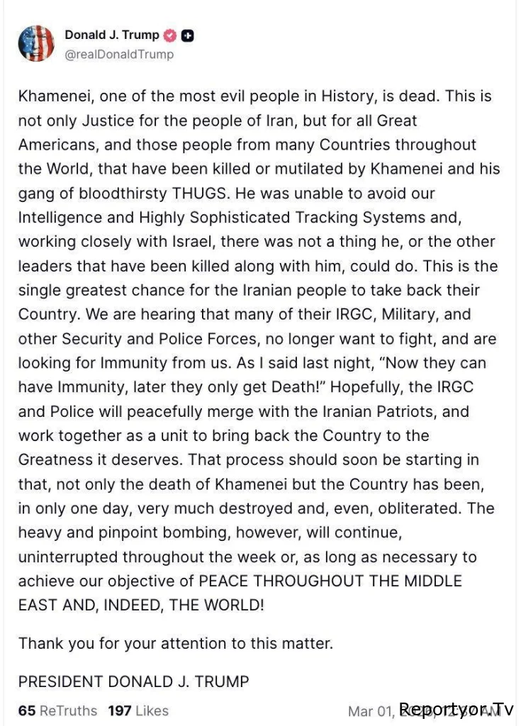 ABŞ prezidenti Donald Tramp İranın ali dini lideri Əli Xamneyinin öldüyünü açıq şəkildə bəyan edib və bunu “ədalətin təntənəsi” adlandırıb.
