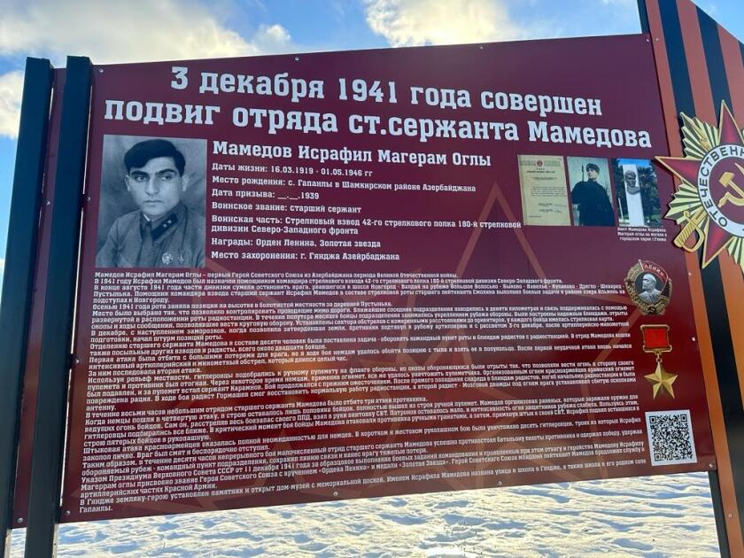 reportyor.tv xəbər verir ki, dekabrın 20-də Novqorod vilayətinin Starorusskoye rayonunun Nagovski kənd qəsəbəsində tarixi əhəmiyyət kəsb edən hadisə baş verib: Azərbaycanın mərd oğlu, Sovet İttifaqı Qəhrəmanı İsrafil Məmmədovun şərəfinə ucaldılmış xatirə lövhəsinin açılışı olub.