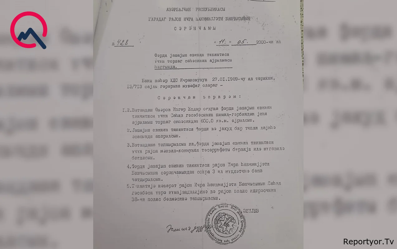 “Hüseyn Babayev bizə torpağın İlqar Ömərov adlı şəxsin adına olduğunu və 11.05. 2000-ci il tarixli 428 saylı tikinti üçün sərəncam alındığını bildirdi. Biz hissə-hissə olmaqla Hüseyn Babayevə 10 min manat pul verdik. O da 6 sot torpağın həyat yoldaşımın adına 80 illik müqavilə ilə keçməsinə dair sənəd təqdim etdi”.