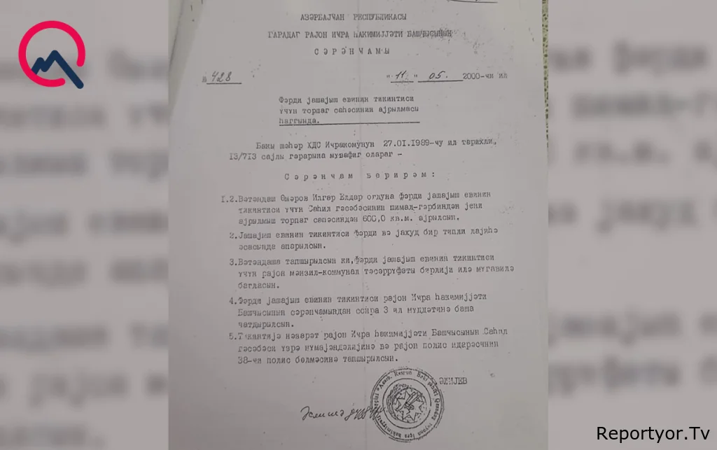 Şikayətçi bildirib ki, bundan sonra həmin torpaq sahəsində 2 ev tikdiriblər. Yalnız bundan sonra torpaq sahəsində tikintiyə icazə verən sərəncamın saxta olduğunu öyrəniblər: