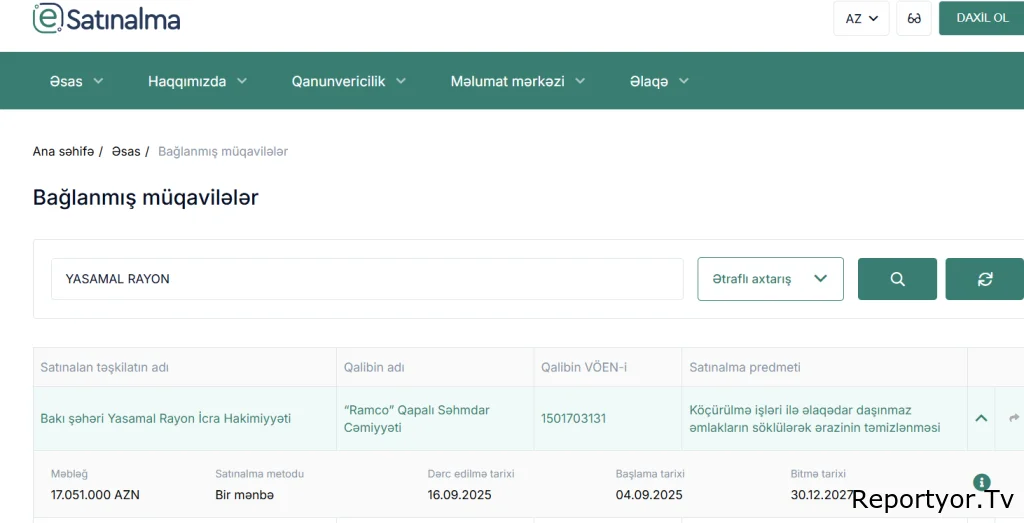 “Ramco” Qapalı Səhmdar Cəmiyyəti – Köçürülmə işləri üçün daşınmaz əmlakların sökülərək ərazinin təmizlənməsi – 17.051.000 AZN