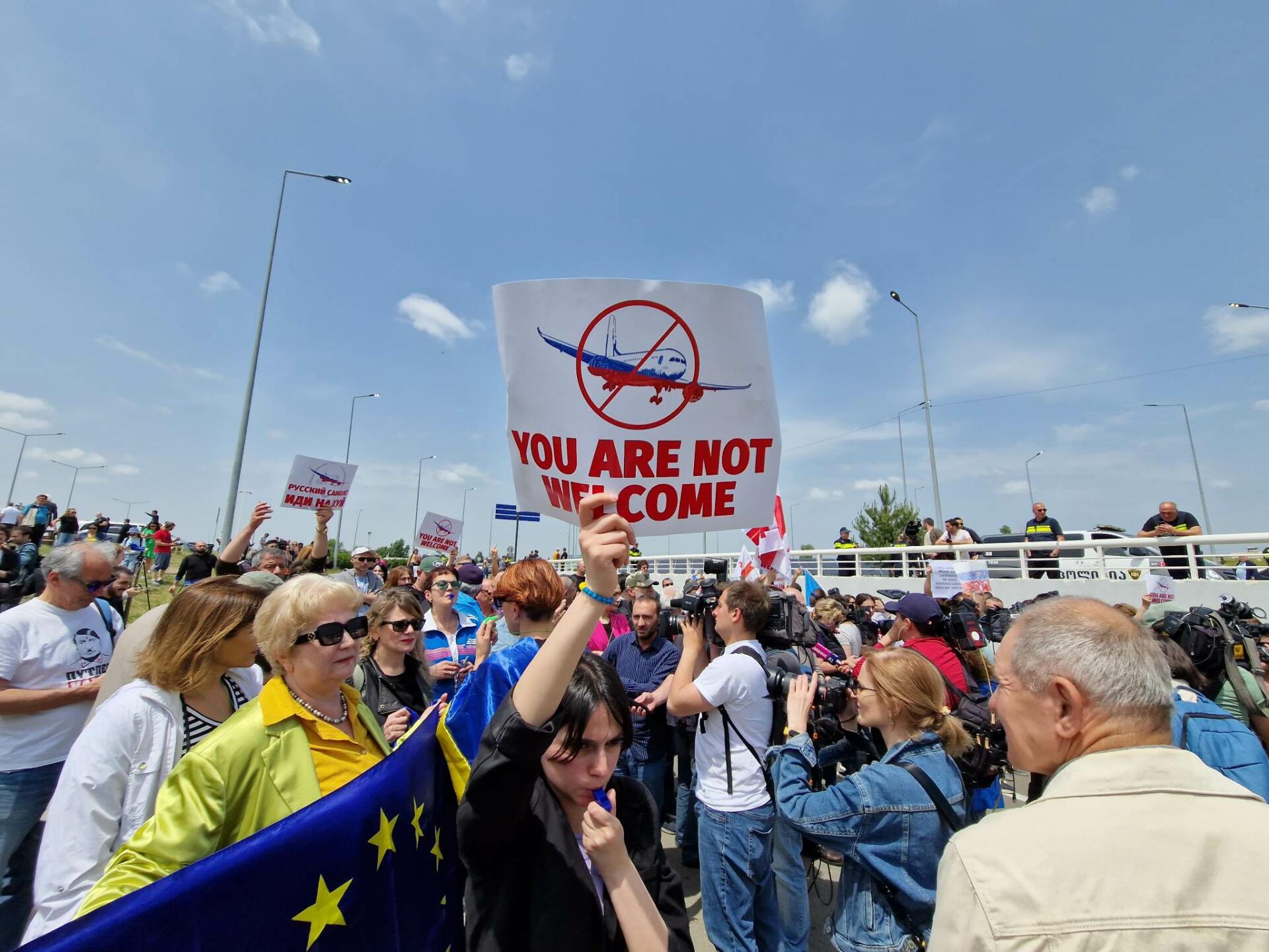 Eyni zamanda hava limanında gürcü müxalifətinin və Rusiyaya birbaşa uçuşların bərpasına qarşı çıxan digər şəxslərin etiraz aksiyası keçirilir. Hüquq-mühafizə orqanlarının gücləndirilmiş dəstələri hava limanına cəlb edilib.