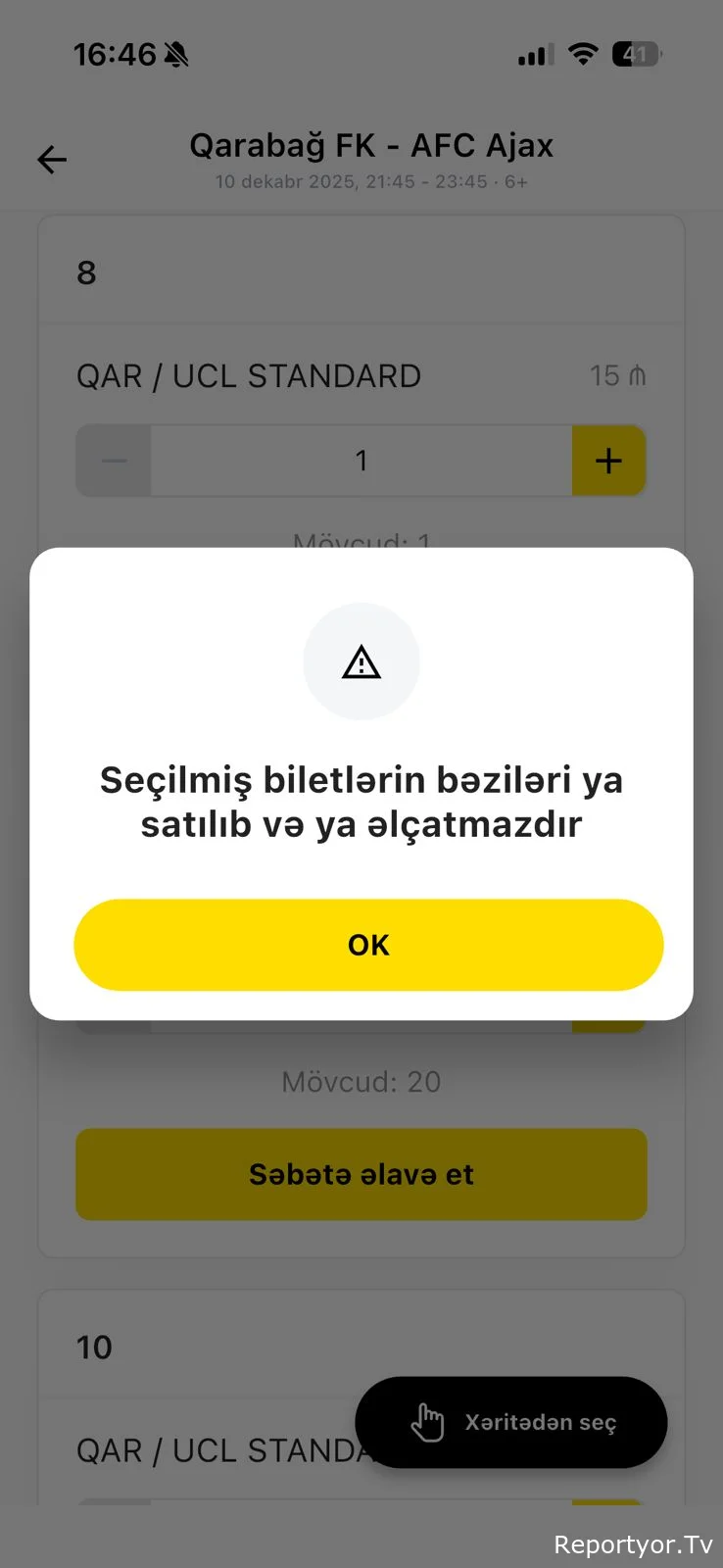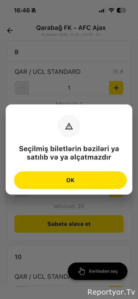 Lakin bilet almaq istəyən azarkeşlər ciddi problemlərlə üzləşiblər. Belə ki, satışın həyata keçirildiyi iTicket.az saytında və mobil tətbiqdə 10, 15, 25 manatlıq standart biletlər görünmədiyi halda, yalnız 400 və 1000 manatlıq VIP/VVIP biletlər alınması mümkün olur. Daha aşağı qiymətli sektorların isə ya görünmədiyi, ya da seçilmədiyi bildirilir.