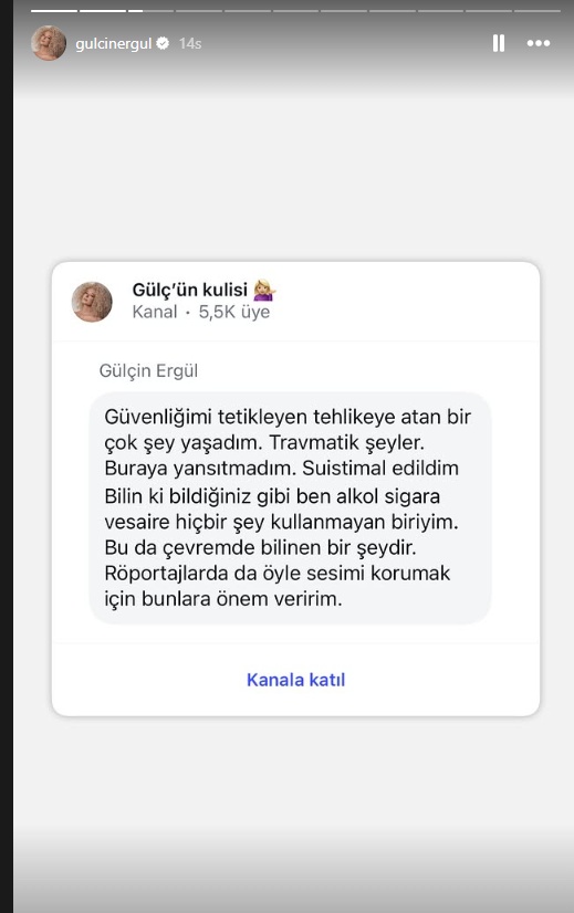 Müğənni özünə məxsus “Gülçün Kulisi” adlı mesajlaşma kanalında paylaşdığı açıqlamalarda uzun müddətdir təhlükəsizliyini təhdid edən hadisələr yaşadığını vurğulayıb: