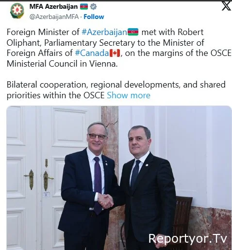 Azərbaycanın xarici işlər naziri Ceyhun Bayramov Vyanada ATƏT Nazirlər Şurasının 32-ci iclası çərçivəsində Kanada Xarici İşlər Nazirliyinin (XİN) parlament katibi Robert Olifantla görüşüb.